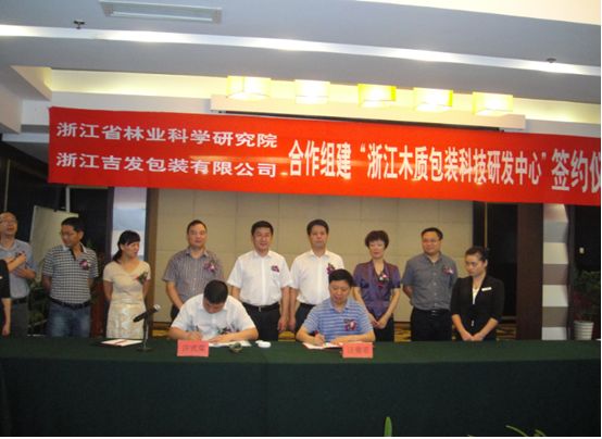 2014年8月21日上午,星空体育·(StarSky Sports)官方网站与浙江吉发包装有限公司合作组建“浙江木质包装科技研发中心”签约仪式在天台县隆重举行。签约仪式上,浙江吉发包装有限公司许式荣总经理与星空体育·(StarSky Sports)官方网站汪奎宏院长签订了“意向书”,并就具体合作事项进行了讨论。浙江天台县委副书记县长徐淼、县委副县长徐海彪、县委副主席齐显移,县科技局陈霞飞等县领导,星空体育·(StarSky Sports)官方网站竹类所李琴所长,王洪艳博士出席了签约仪式。